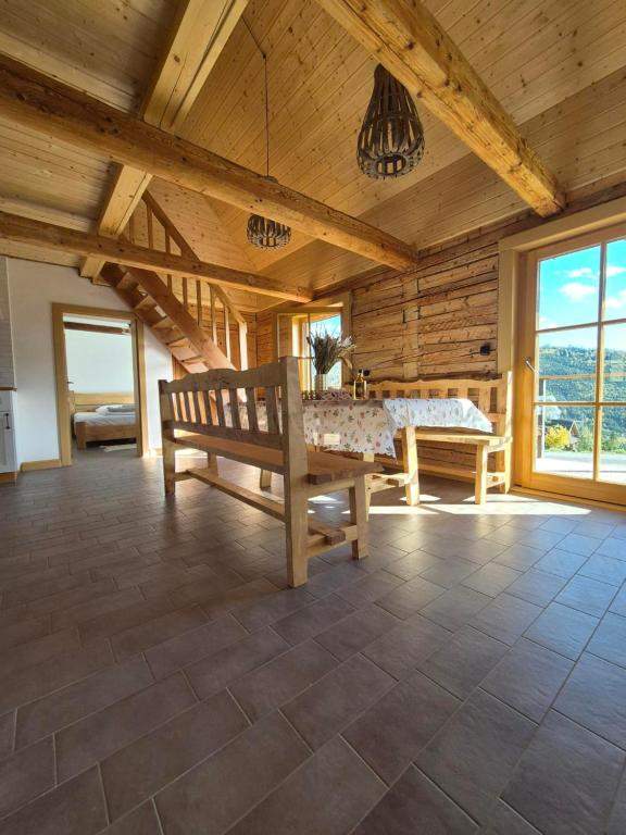 Stylowa chata z elementami retro i nowoczesności, położona na wysokości ponad 700 m n.p.m. Z okien roztacza się niesamowity widok na pasmo Pilska i inne beskidzkie szczyty. Do dyspozycji gości jest jacuzzi, grill elektryczny oraz przestronny taras. Wnętrze zachwyca drewnianym wykończeniem i przytulną atmosferą. Idealne miejsce na relaks i górskie wędrówki.